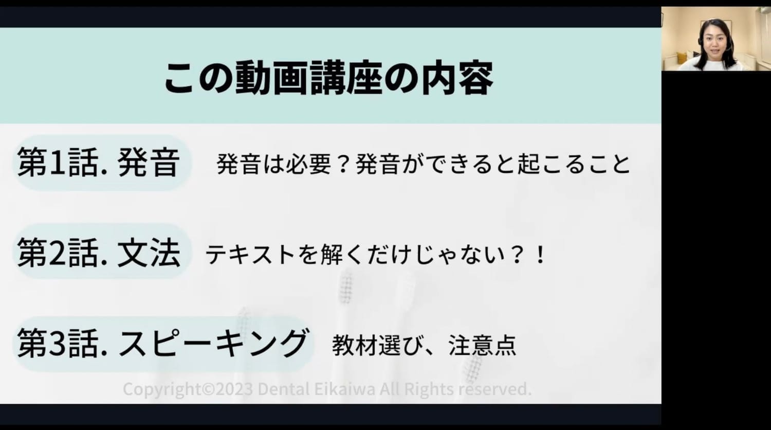 歯科に特化した英語を学びたい、専門的な説明や、痛みと言っても色々な種類もあるのでそういう細かいニュアンスが知りたかったので受講をお願いしました!
